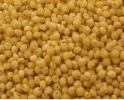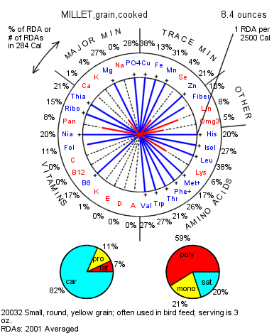 Millet is the yellow, round seed in nearly all birdfeeds. It may be the first cultivated grain, preceding rice as a staple in China, India, and Africa. It is still commonly eaten in those areas and is making a comeback as a human food in Western countries. Of several types, pearl millet has the largest seeds and is most common. It is always whole-grain, and can be used like rice, in soups or to make bread. Relative to calories, millet contains adequate amounts of 24 out of 35 nutrients shown here, especially copper, manganese, phosphorus, magnesium, thiamin, niacin, and vitamin B6.