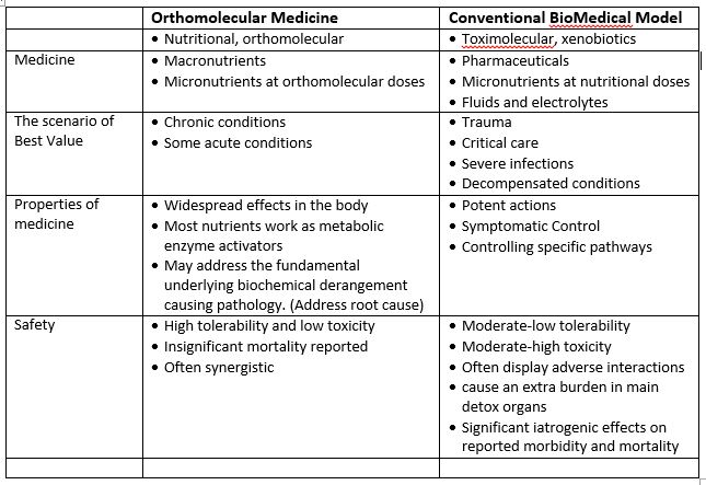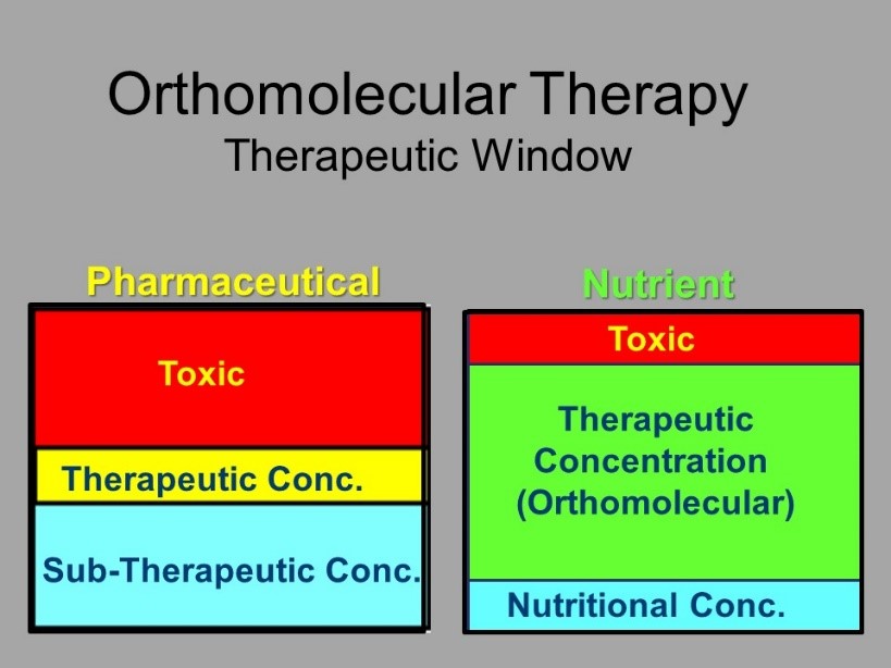 "No illness which can be treated by diet should be treated by any other means." Metabolic enzymes catalyze all biochemical reactions in the body. Enzymes make and degrade neurotransmitters, allow for the expression or suppression of genes, make hormones, and facilitate all aspects of metabolism. Both natural and conventional healthcare practitioners seek to understand and influence metabolic enzymes, but in different ways. Drugs and micronutrients have fundamental differences. A key difference is that most drugs work by causing an effect on specific molecules. For example, drugs can function by blocking voltage-dependent ion channels and membrane transporters. Antimicrobials act by disrupting structures or metabolic pathways key to pathogen survival. Many drugs are strong inhibitors of metabolic enzymes, and are intended to have specific and restricted action. Most essential micronutrients, in contrast, work as metabolic enzyme activators and have multiple actions. There are a few exceptions to this rule, for example, hormone replacement therapy does not directly modulate enzyme activity. Drugs can induce nutrient deficiencies as well as numerous unwanted side effects. Some common medicines used long-term interfere with nutrient availability, such as arthritis pain medications, cholesterol-lowering statins, birth control pills, and antibiotics. For example, statin drugs block the enzyme that produces cholesterol in the liver, thereby lowering cholesterol. However, other metabolic enzymes are blocked as well, causing weakness, joint pain, insomnia, rashes, muscle pain, headaches, infections, sinusitis, chest pain, and peripheral edema. While the benefits of utilizing a drug may outweigh the risks, it is important to note that medication usually does not correct the condition which caused a chronic health problem in the first place. Drugs are often designed to take care of the symptom but not the root of the problem. This highlights a very relevant philosophical difference between orthomolecular medicine vs conventional medicine approaches to health. Orthomolecular medicine works by supplying appropriate levels of essential nutrients to the body's biochemistry to correct the deficiency that leads to the unbalanced state we call disease. [13,14] These characteristics of nutrients vs pharmaceuticals in orthomolecular and conventional medicine are summarized in Table 1. In order to mitigate the risk of nutrient deficiency-associated side effects of medication, the diet should be manipulated to provide additional food sources and supplements and essential nutrients. This will generally require higher than RDA levels of essential nutrients as rectification of deficiencies will not be sufficient from diet alone, because the disease process usually increases micronutrient needs. In addition, drug metabolism may also consume additional micronutrients and therefore can cause drug-induced nutrient depletion. [15] Another important iatrogenic issue is drug-induced mitochondrial dysfunction. Cancer chemotherapeutic agents [16,17] and most medications in general [18,19] that are taken chronically can induce serious mitochondriopathies that can result in liver damage, cardiotoxicity, and neuropathies. Drugs known to cause mitochondrial dysfunction include NSAIDs, Acetaminophen, statins, antidepressants, Metformin and others. These effects can be mitigated by the proper use of micronutrients such as vitamin C, lipoic acid, and N-Acetylcysteine, molecular replacement of membrane lipids and enzymatic cofactors, such as coenzyme Q10. [20] Phytochemicals such as curcumin, quercetin, and polyphenols have been shown to reduce necrotic cell death, restore the antioxidant defense mechanism, limit oxidative stress, and prevent the inflammation of tissue and dysfunction of the mitochondria. [21] The basis of orthomolecular medicine is providing essential nutrients in adequate doses according to the needs and deficiencies of the body's metabolism. Essential micronutrients are required for the activity of many enzymes. Magnesium is required by several hundred different enzymes, [22} and so is NAD+, supplied by niacin. Essential micronutrients (vitamins, minerals, and other cofactors) from the diet or taken as supplements can therefore promote optimization of many aspects of metabolism. This qualitative difference in the nature of a pharmaceutical drug and a micronutrient often seems to lead to confusion and misunderstanding. Therefore, we propose the use of the terms "nutrikinetics" and "nutridynamics" to describe how nutrients such as vitamins and minerals enter the bloodstream upon absorption and get distributed to the body's organs. These equilibrate rapidly from blood plasma when they reach highly perfused tissues (e.g. red blood cells, liver, kidney) but more slowly with adipose tissue, skin and poorly perfused organs. The therapeutic window differenceThe therapeutic window for a drug is the relationship between the therapeutic and toxic dose. A generalization we can make for nutrients compared to drugs is that the therapeutic dose for nutrients is much farther below the toxic dose. This is a very powerful argument for nutritional intervention (diet and supplementation) prior to the use of medications as the first line of treatment. Dietary supplements are gentle and safe, containing micronutrients such as vitamins and minerals that contribute to normalizing the underlying biochemical deficiencies caused by disease. Nutrients, therefore, have a broad therapeutic window, and in comparison, pharmaceutical drugs in general have a narrow therapeutic window. (See Figure 1). Because of the substantial danger of drug toxicity, prescription errors are of concern. In fact, it has been reported that drug-related iatrogenia in hospitals accounted for 106,000 deaths per year in the United States. [23] In addition, a study in ambulatory patients revealed that drug-related morbidity and mortality was 76 billion in 1995. [24]